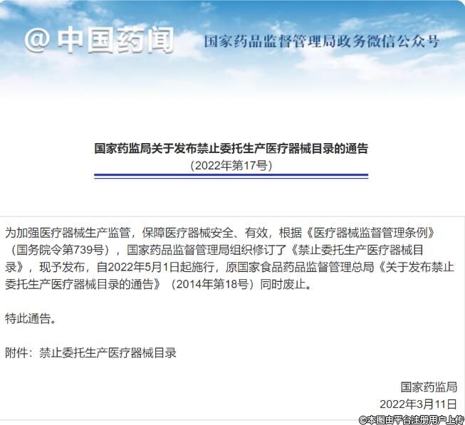 《禁止委托生產(chǎn)醫(yī)療器械目錄(2022年第17號(hào))》是在法規(guī)和標(biāo)準(zhǔn)的不斷完善、科學(xué)技術(shù)的不斷發(fā)展之下進(jìn)行的適時(shí)的調(diào)整。《目錄》的實(shí)施,將對(duì)降低相關(guān)產(chǎn)品不良事件、保障產(chǎn)品安全發(fā)揮出有益作用。