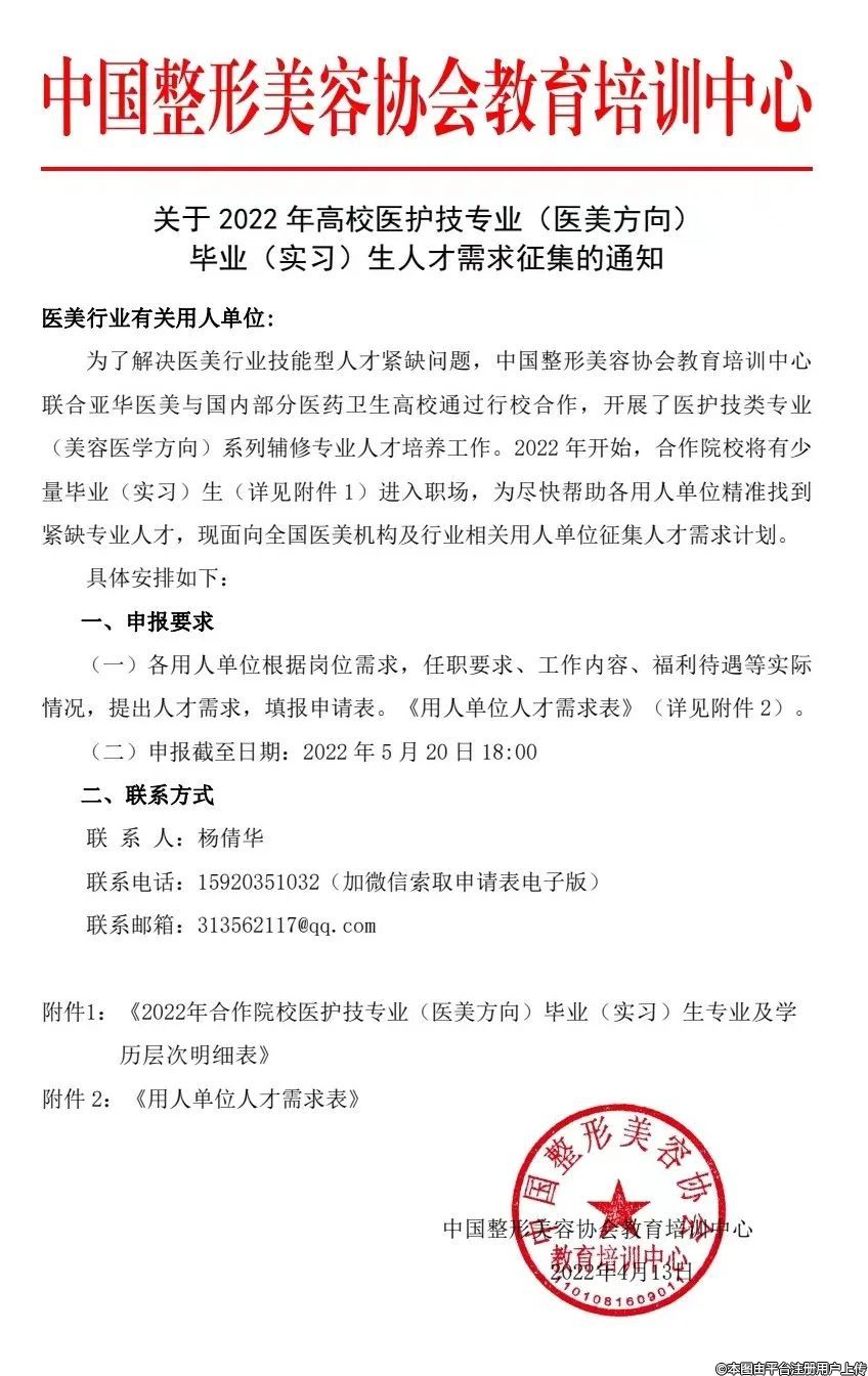 4月13日,中國整形美容協(xié)會(huì)教育培訓(xùn)中心發(fā)布關(guān)于征集2022年高校醫(yī)護(hù)技專業(yè)(醫(yī)美方向)畢業(yè)(實(shí)習(xí))生人才需求計(jì)劃的通知,并公布了此次合作院校醫(yī)護(hù)技專業(yè)(醫(yī)美方向)畢業(yè)(實(shí)習(xí))生及學(xué)歷層次明細(xì)表。