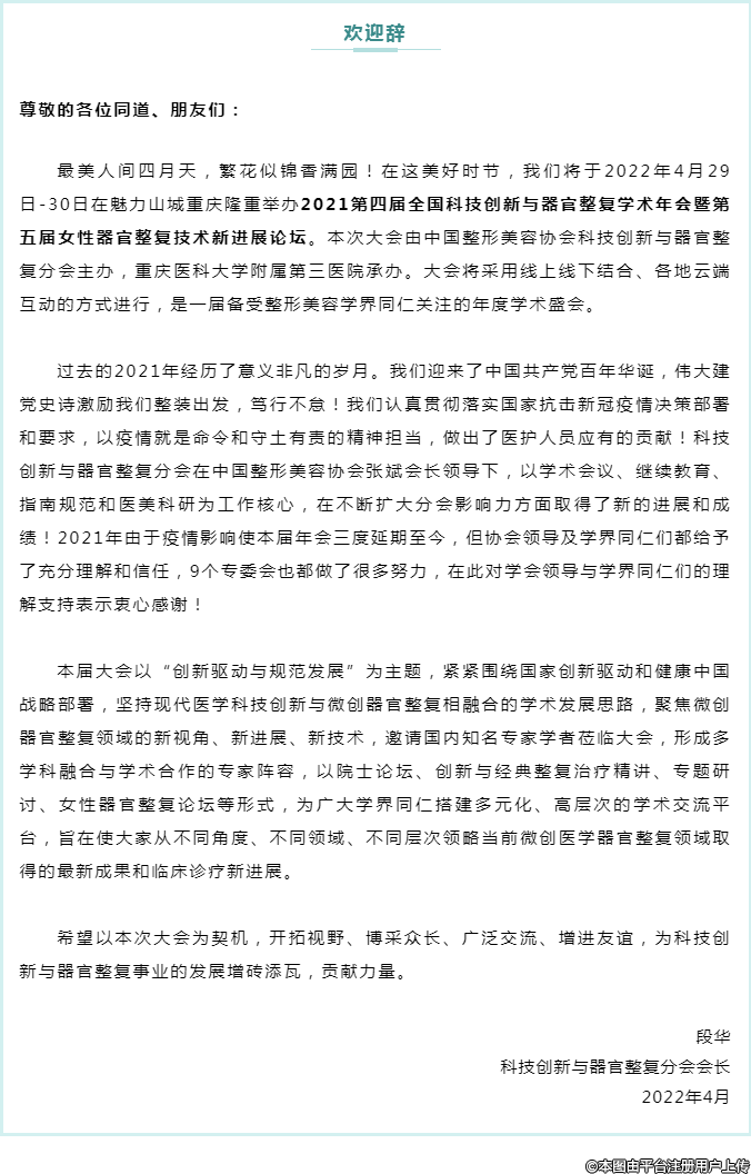 2022.4.29-30 重慶 2021第四屆全國科技創(chuàng)新與器官整復學術年會暨第五屆女性器官整復新進展論壇通知