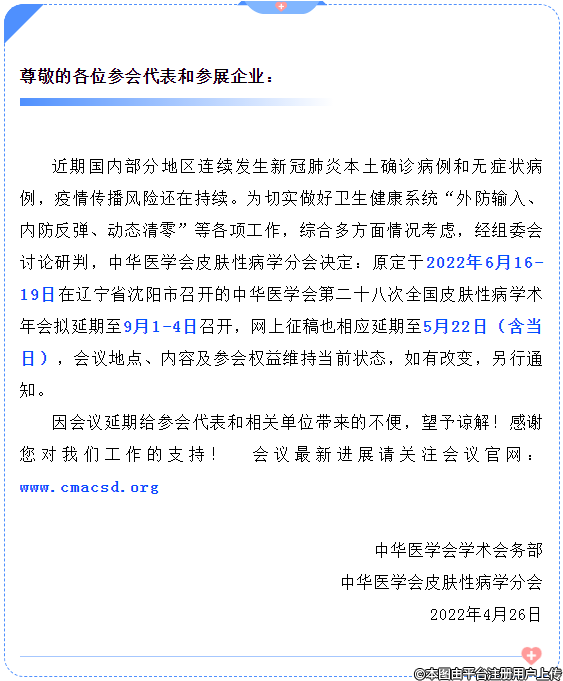 關(guān)于延期召開(kāi)中華醫(yī)學(xué)會(huì)第二十八次全國(guó)皮膚性病學(xué)術(shù)年會(huì)的通知