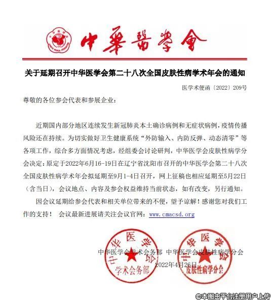 因受疫情影響,原定于2022年6月16-19日在遼寧省沈陽(yáng)市召開(kāi)的中華醫(yī)學(xué)會(huì)第二十八次全國(guó)皮膚性病學(xué)術(shù)年會(huì)擬延期至9月1-4日召開(kāi)。,網(wǎng)上征稿也相應(yīng)延期至5月22日(含當(dāng)日)。