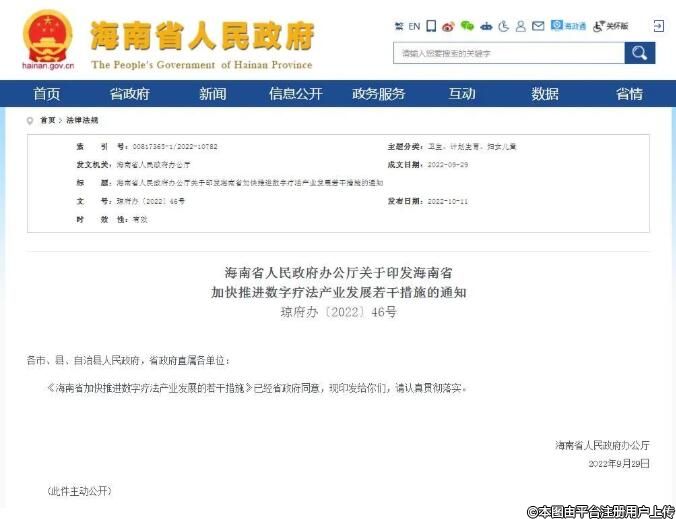 10月11日消息,海南省人民政府辦公廳對外印發(fā)《海南省加快推進(jìn)數(shù)字療法產(chǎn)業(yè)發(fā)展若干措施》(以下簡稱“《若干措施》”)。