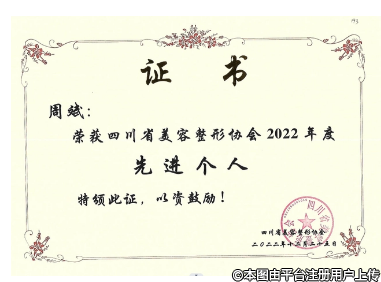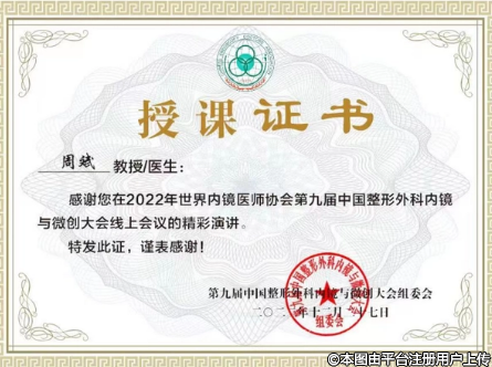 為表彰周斌院長在“2022年世界內(nèi)鏡醫(yī)師協(xié)會第九屆中國整形外科內(nèi)鏡與微創(chuàng)大會線上會議的”精彩演講,第九屆中國整形外科內(nèi)鏡與微創(chuàng)大會組委會為周斌院長頒發(fā)了授課證書,四川省整形美容協(xié)會為周斌院長頒發(fā)了“2022年度先進個人”的榮譽證書。