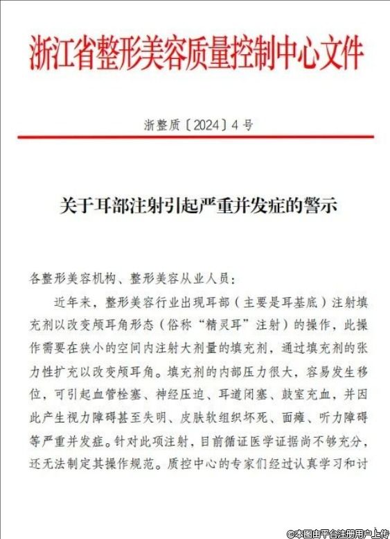 近期,我們注意到整形美容行業(yè)中出現(xiàn)了一種新的操作趨勢,即通過在耳部(尤其是耳基底區(qū)域)注射填充劑來改變顱耳角的形態(tài),俗稱“精靈耳”注射。雖然這一操作旨在滿足部分消費者對于特定耳部形態(tài)的追求,但其潛在的風險和并發(fā)癥不容忽視。請各位醫(yī)療美容從業(yè)人員務必高度重視以下文件浙整質[2024]4號,切實履行好自身的職責和義務,保障患者的安全和健康。