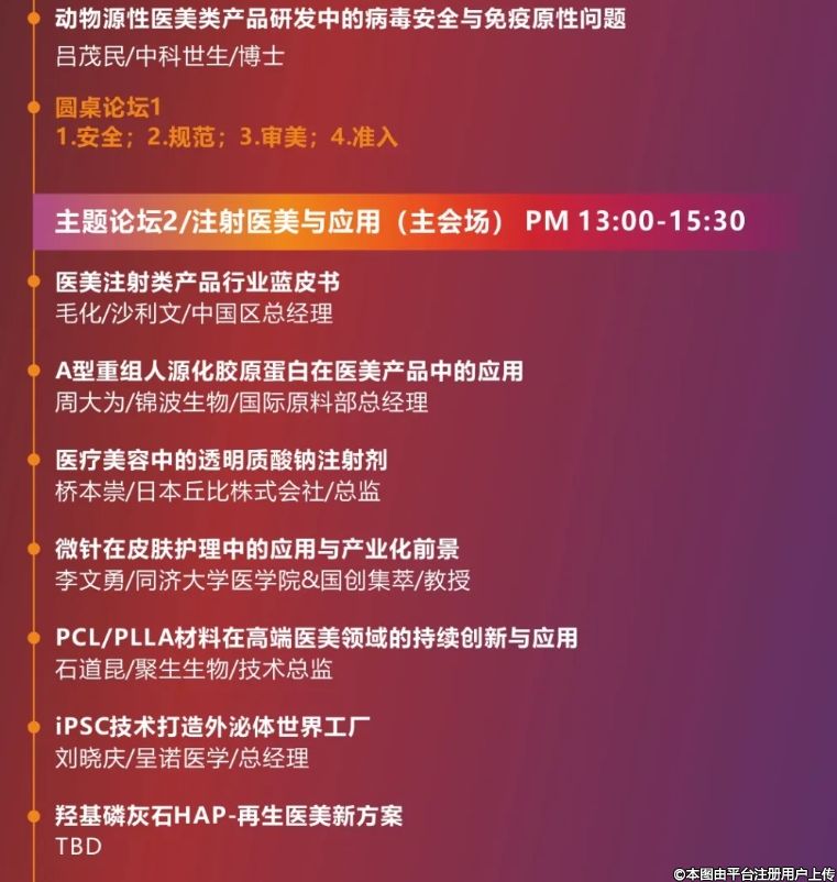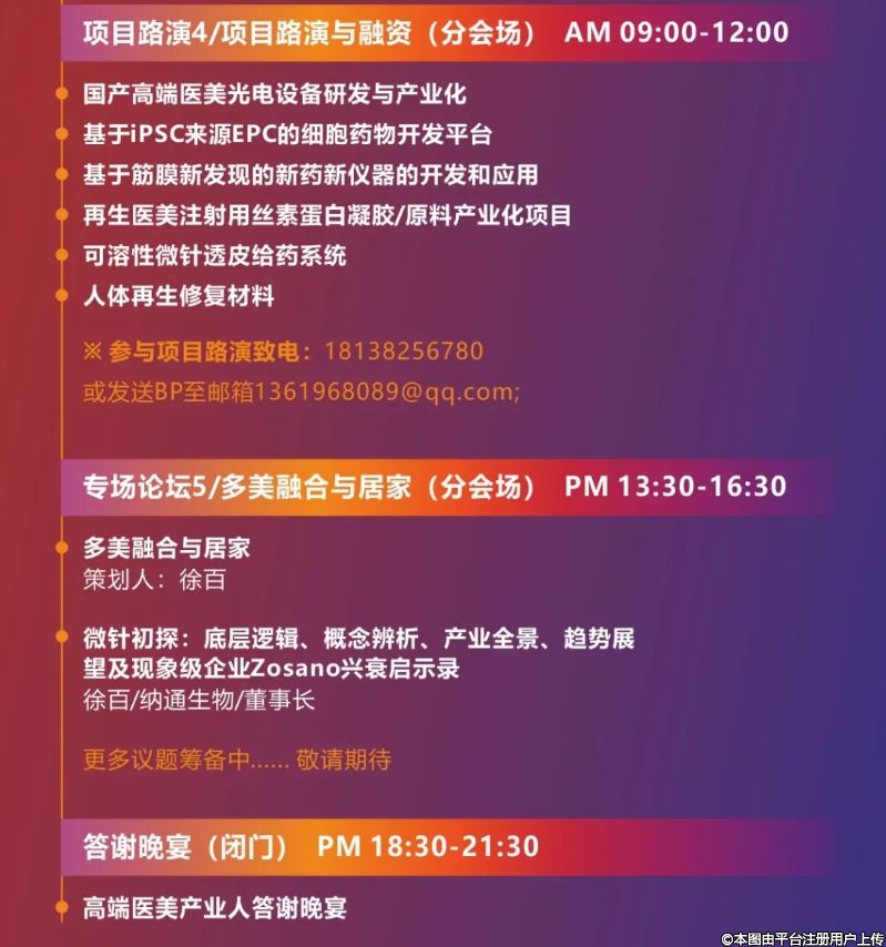 據(jù)悉,本次大會(huì)將從安全規(guī)范與市場(chǎng)準(zhǔn)入、注射醫(yī)美與應(yīng)用、光電醫(yī)美與儀器、多醫(yī)美融合與創(chuàng)新、項(xiàng)目路演與融資等六大領(lǐng)域開(kāi)展論壇,進(jìn)行深入研討與交流,加速國(guó)內(nèi)醫(yī)美生態(tài)圈建設(shè),全面、深度剖析、展望高端醫(yī)美器械的現(xiàn)狀與未來(lái),助力醫(yī)美賽道健康與穩(wěn)定發(fā)展。其中安全規(guī)范與市場(chǎng)準(zhǔn)入論壇將會(huì)邀請(qǐng)相關(guān)主管部門領(lǐng)導(dǎo)解析政策,同時(shí)圍繞安全、合規(guī)、注冊(cè)、動(dòng)物實(shí)驗(yàn)、檢測(cè)、準(zhǔn)入等層面進(jìn)行探討;注射醫(yī)美與應(yīng)用論壇則緊扣醫(yī)美材料、器械和醫(yī)美方案進(jìn)行研究;光電醫(yī)美與儀器論壇將深入探討光電醫(yī)美產(chǎn)業(yè)市場(chǎng)發(fā)展最新趨勢(shì)和機(jī)會(huì),并就微針和注射器的設(shè)計(jì)與制造全產(chǎn)業(yè)鏈展開(kāi)討論;多醫(yī)美融合與創(chuàng)新論壇將就多醫(yī)美與智能家居領(lǐng)域展開(kāi)分析與展望;而項(xiàng)目路演與融資將搭建醫(yī)美產(chǎn)業(yè)企業(yè)與投資機(jī)構(gòu)交流平臺(tái),促使資本與產(chǎn)業(yè)融合,助力醫(yī)美產(chǎn)業(yè)進(jìn)一步高速發(fā)展,目前佰福激光、呈諾醫(yī)學(xué)、翼維峰醫(yī)療、繡麗醫(yī)藥、新世元生物、藍(lán)皓生物等超過(guò)10家企業(yè)已報(bào)名參與。