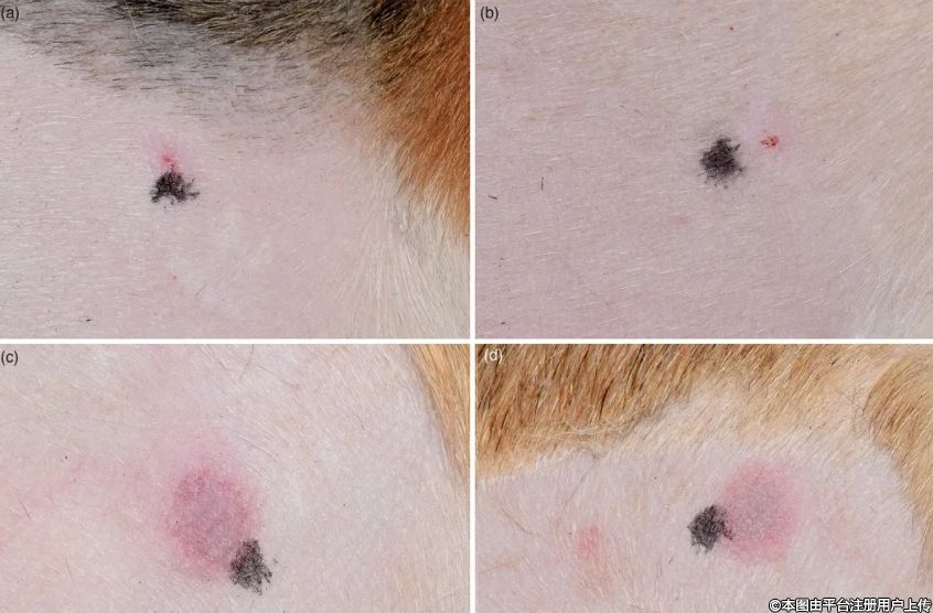 結果顯示,50%甘油鹽水注射在所有犬中誘導出明顯的紅斑和硬結。
