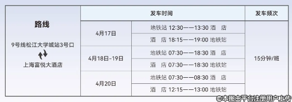 為方便參會(huì)人員會(huì)議出行,大會(huì)期間安排地鐵9號(hào)線松江大學(xué)3號(hào)出口至富悅酒店大會(huì)往返班車接駁。4月18日-19日7:30——18:30全天地鐵站至酒店班車接駁,更多大會(huì)班車發(fā)車信息見下方發(fā)車表。