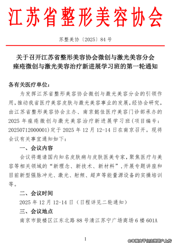 為發(fā)揮江蘇省整形美容協(xié)會(huì)微創(chuàng)與激光美容分會(huì)的引領(lǐng)作用,推動(dòng)我省醫(yī)療美容皮膚與激光美容事業(yè)的發(fā)展,經(jīng)協(xié)會(huì)研究,由江蘇省整形美容協(xié)會(huì)主辦、南京懿佳醫(yī)療美容門診部承辦的2025年痤瘡微創(chuàng)與激光美容治療新進(jìn)展學(xué)習(xí)班(項(xiàng)目編號(hào):20250712000001)定于2025年12月12-14日在南京召開。現(xiàn)將會(huì)議有關(guān)事宜通知如下: