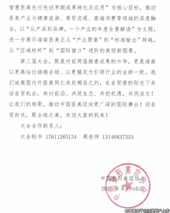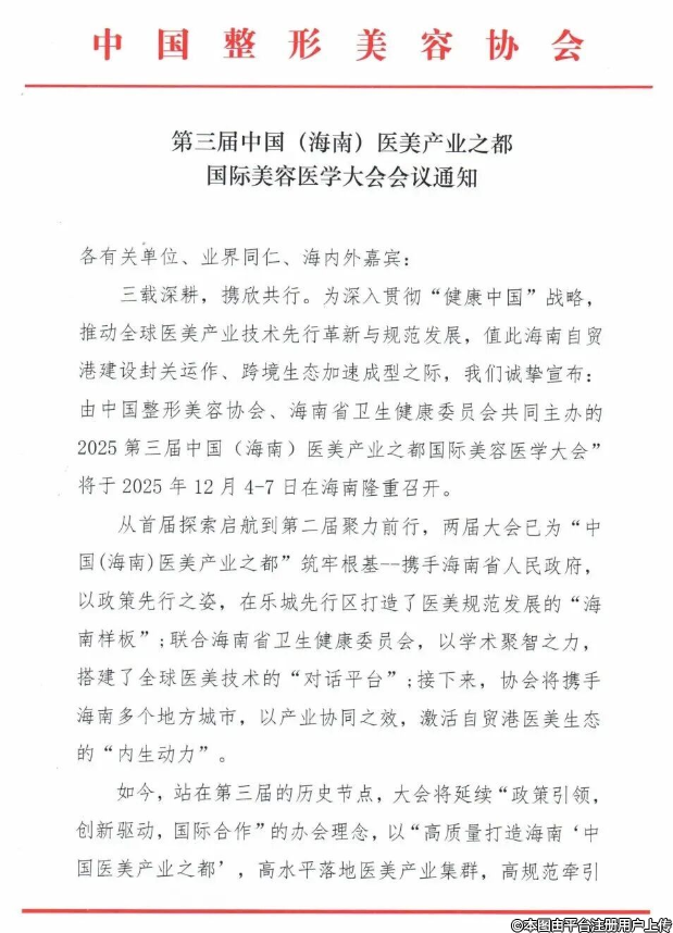三載深耕,攜欣共行。為深入貫徹“健康中國”戰(zhàn)略,推動全球醫(yī)美產(chǎn)業(yè)技術(shù)先行革新與規(guī)范發(fā)展,值此海南自貿(mào)港建設(shè)封關(guān)運作、跨境生態(tài)加速成型之際,我們誠摯宣布:由中國整形美容協(xié)會、海南省衛(wèi)生健康委員會共同主辦的2025第三屆中國(海南)醫(yī)美產(chǎn)業(yè)之都國際美容醫(yī)學(xué)大會”將于2025年12月 4-7日在海南隆重召開。