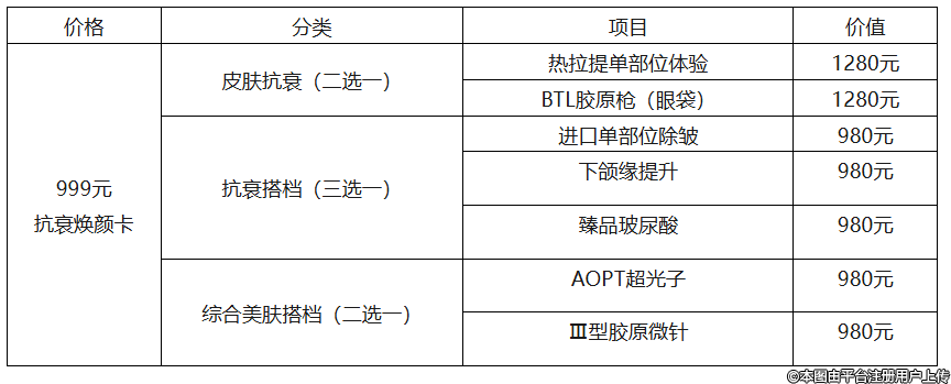 999元抗衰煥顏卡:熱拉提、BTL膠原槍、AOPT超光子、臻品玻尿酸等熱門項目任您選擇,開啟肌膚煥新之旅。