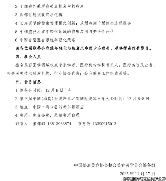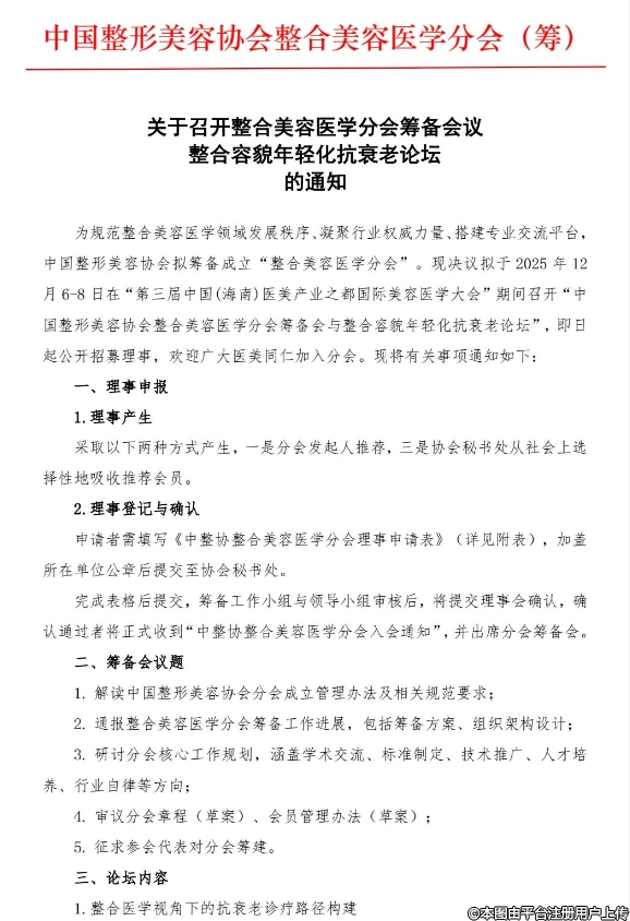 “中國整形美容協(xié)會整合美容醫(yī)學(xué)分會籌備會暨整合容貌年輕化抗衰老論壇”——本次活動是中國醫(yī)學(xué)多學(xué)科整合趨勢,匯聚醫(yī)美領(lǐng)域?qū)<遗c同仁,一方面研討整合美容醫(yī)學(xué)分會的建設(shè)規(guī)劃、行業(yè)標(biāo)準制定及人才培養(yǎng)等核心議題,另一方面圍繞容貌年輕化與抗衰老領(lǐng)域的前沿技術(shù)、臨床實踐、安全規(guī)范展開交流。