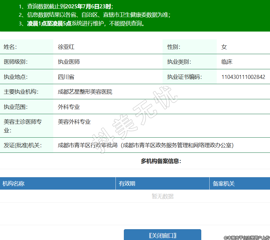 姓名:徐亞紅性別:女醫(yī)師級別:執(zhí)業(yè)醫(yī)師執(zhí)業(yè)類別:臨床執(zhí)業(yè)地點:四川省執(zhí)業(yè)證書編碼:110430111002842主要執(zhí)業(yè)機(jī)構(gòu):成都藝星整形美容醫(yī)院執(zhí)業(yè)范圍:外科專業(yè)美容主診醫(yī)師專業(yè):美容外科專業(yè)發(fā)證(批準(zhǔn))機(jī)關(guān):成都市青羊區(qū)行政審批局(成都市青羊區(qū)政務(wù)服務(wù)管理和網(wǎng)絡(luò)理政辦公室) -