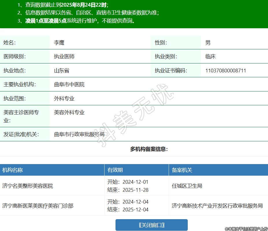機構(gòu)名稱 有效期 備案機關(guān) 濟寧名美整形美容醫(yī)院 開始:2024-12-01結(jié)束:2025-11-28任城區(qū)衛(wèi)生局 濟寧高新醫(yī)萊美醫(yī)療美容門診部 開始:2024-12-04結(jié)束:2025-12-04濟寧高新技術(shù)產(chǎn)業(yè)開發(fā)區(qū)行政審批服務(wù)局 -