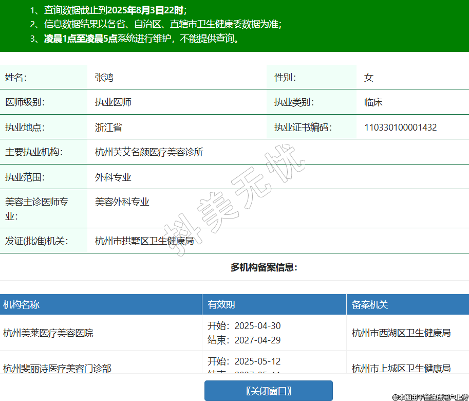 機構(gòu)名稱 有效期 備案機關 杭州美萊醫(yī)療美容醫(yī)院 開始:2025-04-30結(jié)束:2027-04-29杭州市西湖區(qū)衛(wèi)生健康局 杭州斐麗詩醫(yī)療美容門診部 開始:2025-05-12結(jié)束:2027-05-11杭州市上城區(qū)衛(wèi)生健康局 -