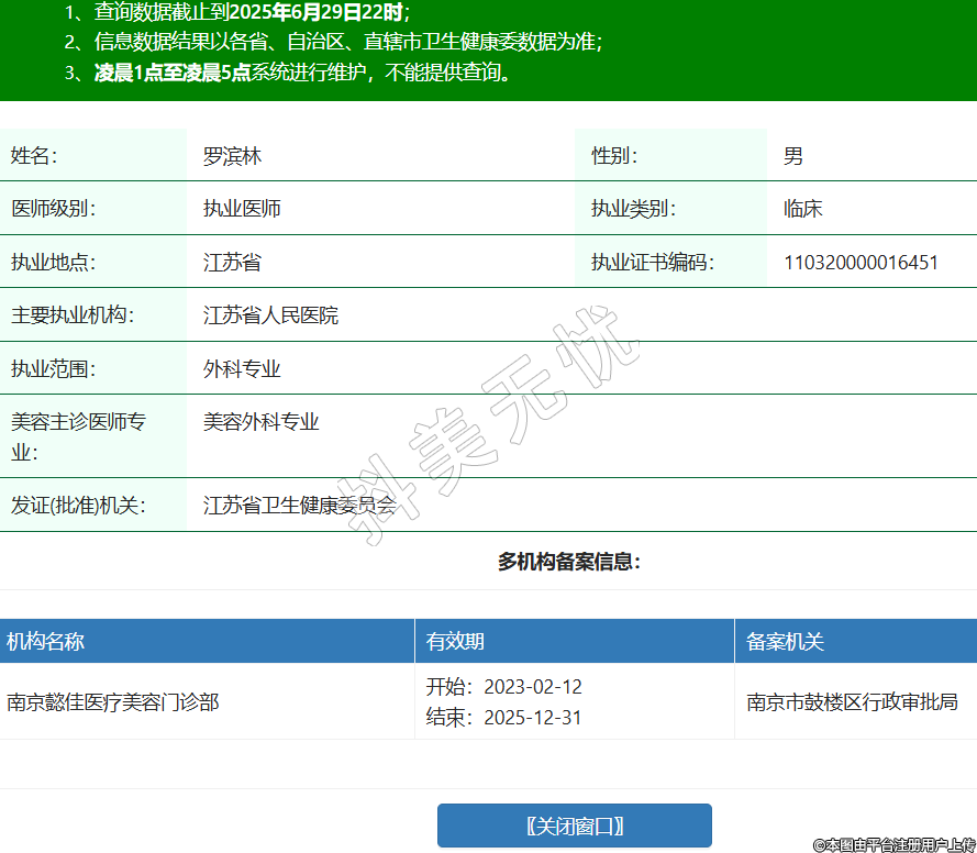機(jī)構(gòu)名稱 有效期 備案機(jī)關(guān) 南京懿佳醫(yī)療美容門診部 開(kāi)始:2023-02-12結(jié)束:2025-12-31南京市鼓樓區(qū)行政審批局 -