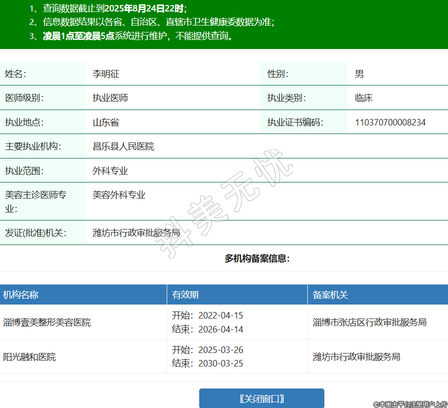 姓名:李明征性別:男醫(yī)師級(jí)別:執(zhí)業(yè)醫(yī)師執(zhí)業(yè)類別:臨床執(zhí)業(yè)地點(diǎn):山東省執(zhí)業(yè)證書編碼:110370700008234主要執(zhí)業(yè)機(jī)構(gòu):昌樂縣人民醫(yī)院執(zhí)業(yè)范圍:外科專業(yè)美容主診醫(yī)師專業(yè):美容外科專業(yè)發(fā)證(批準(zhǔn))機(jī)關(guān):濰坊市行政審批服務(wù)局多機(jī)構(gòu)備案信息:機(jī)構(gòu)名稱 有效期 備案機(jī)關(guān) 淄博壹美整形美容醫(yī)院 開始:2022-04-15結(jié)束:2026-04-14淄博市張店區(qū)行政審批服務(wù)局 陽光融和醫(yī)院 開始:2025-03-26結(jié)束:2030-03-25濰坊市行政審批服務(wù)局 -