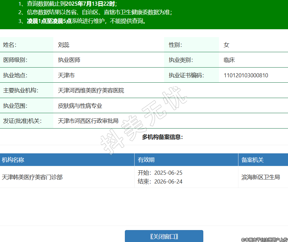 姓名:劉蕊性別:女醫(yī)師級(jí)別:執(zhí)業(yè)醫(yī)師執(zhí)業(yè)類別:臨床執(zhí)業(yè)地點(diǎn):天津市執(zhí)業(yè)證書編碼:110120103000810主要執(zhí)業(yè)機(jī)構(gòu):天津河西維美醫(yī)療美容醫(yī)院執(zhí)業(yè)范圍:皮膚病與性病專業(yè)發(fā)證(批準(zhǔn))機(jī)關(guān):天津市河西區(qū)行政審批局多機(jī)構(gòu)備案信息:機(jī)構(gòu)名稱 有效期 備案機(jī)關(guān) 天津韓美醫(yī)療美容門診部 開始:2025-06-25結(jié)束:2026-06-24濱海新區(qū)衛(wèi)生局 -