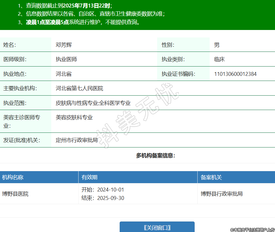 姓名:鄧芳輝性別:男醫(yī)師級(jí)別:執(zhí)業(yè)醫(yī)師執(zhí)業(yè)類別:臨床執(zhí)業(yè)地點(diǎn):河北省執(zhí)業(yè)證書(shū)編碼:110130600012384主要執(zhí)業(yè)機(jī)構(gòu):河北省第七人民醫(yī)院執(zhí)業(yè)范圍:皮膚病與性病專業(yè);全科醫(yī)學(xué)專業(yè)美容主診醫(yī)師專業(yè):美容皮膚科專業(yè)發(fā)證(批準(zhǔn))機(jī)關(guān):定州市行政審批局多機(jī)構(gòu)備案信息:機(jī)構(gòu)名稱 有效期 備案機(jī)關(guān) 博野縣醫(yī)院 開(kāi)始:2024-10-01結(jié)束:2025-09-30博野縣行政審批局 -