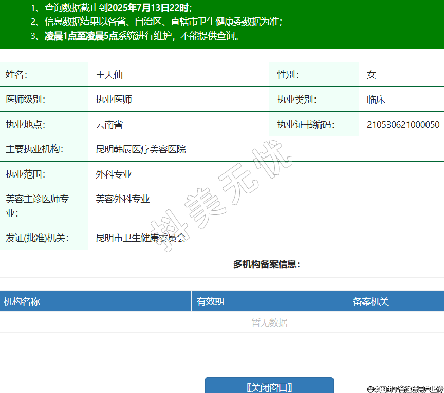 姓名:王天仙性別:女醫(yī)師級(jí)別:執(zhí)業(yè)醫(yī)師執(zhí)業(yè)類別:臨床執(zhí)業(yè)地點(diǎn):云南省執(zhí)業(yè)證書編碼:210530621000050主要執(zhí)業(yè)機(jī)構(gòu):昆明韓辰醫(yī)療美容醫(yī)院執(zhí)業(yè)范圍:外科專業(yè)美容主診醫(yī)師專業(yè):美容外科專業(yè)發(fā)證(批準(zhǔn))機(jī)關(guān):昆明市衛(wèi)生健康委員會(huì) -
