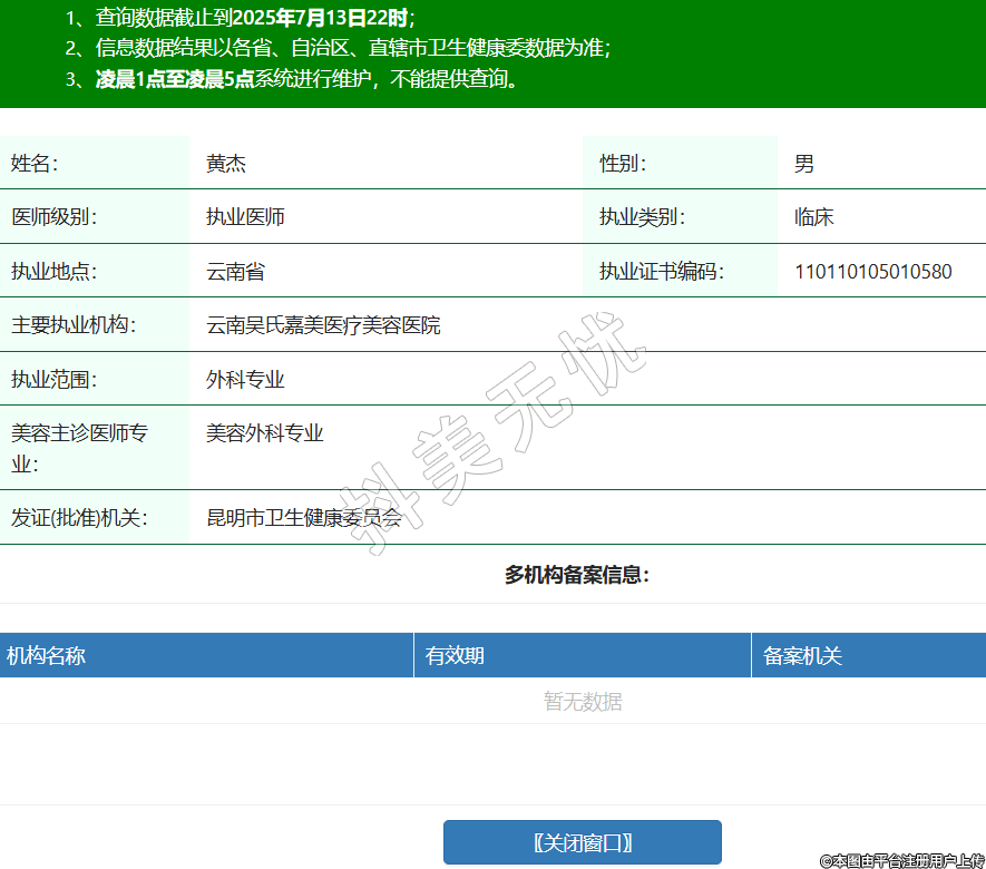 姓名:黃杰性別:男醫(yī)師級別:執(zhí)業(yè)醫(yī)師執(zhí)業(yè)類別:臨床執(zhí)業(yè)地點:云南省執(zhí)業(yè)證書編碼:110110105010580主要執(zhí)業(yè)機構:云南吳氏嘉美醫(yī)療美容醫(yī)院執(zhí)業(yè)范圍:外科專業(yè)美容主診醫(yī)師專業(yè):美容外科專業(yè)發(fā)證(批準)機關:昆明市衛(wèi)生健康委員會 姓名:黃杰性別:男醫(yī)師級別:執(zhí)業(yè)醫(yī)師執(zhí)業(yè)類別:臨床執(zhí)業(yè)地點:云南省執(zhí)業(yè)證書編碼:110110105010580主要執(zhí)業(yè)機構:云南吳氏嘉美醫(yī)療美容醫(yī)院執(zhí)業(yè)范圍:外科專業(yè)美容主診醫(yī)師專業(yè):美容外科專業(yè)發(fā)證(批準)機關:昆明市衛(wèi)生健康委員會