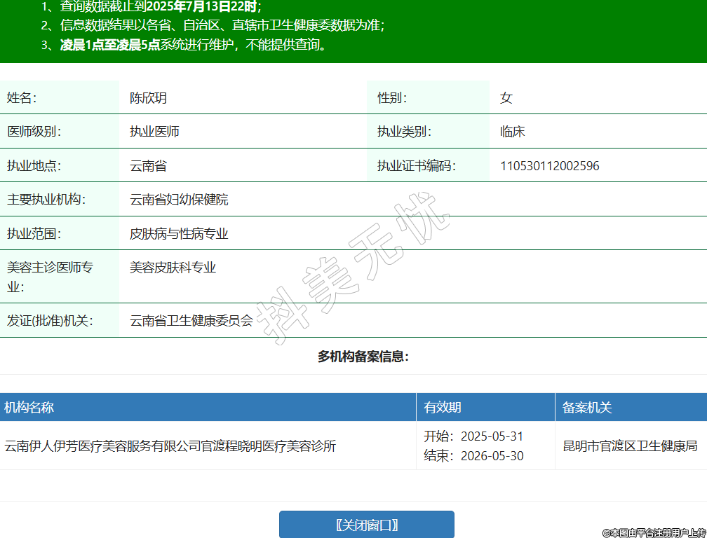 姓名:陳欣玥性別:女醫(yī)師級別:執(zhí)業(yè)醫(yī)師執(zhí)業(yè)類別:臨床執(zhí)業(yè)地點(diǎn):云南省執(zhí)業(yè)證書編碼:110530112002596主要執(zhí)業(yè)機(jī)構(gòu):云南省婦幼保健院執(zhí)業(yè)范圍:皮膚病與性病專業(yè)美容主診醫(yī)師專業(yè):美容皮膚科專業(yè)發(fā)證(批準(zhǔn))機(jī)關(guān):云南省衛(wèi)生健康委員會多機(jī)構(gòu)備案信息:機(jī)構(gòu)名稱 有效期 備案機(jī)關(guān) 云南伊人伊芳醫(yī)療美容服務(wù)有限公司官渡程曉明醫(yī)療美容診所 開始:2025-05-31結(jié)束:2026-05-30昆明市官渡區(qū)衛(wèi)生健康局 -