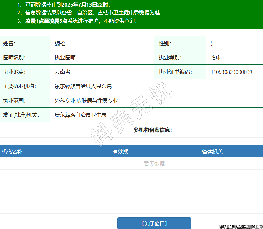 姓名:魏松性別:男醫(yī)師級別:執(zhí)業(yè)醫(yī)師執(zhí)業(yè)類別:臨床執(zhí)業(yè)地點:云南省執(zhí)業(yè)證書編碼:110530823000039主要執(zhí)業(yè)機構(gòu):景東彝族自治縣人民醫(yī)院執(zhí)業(yè)范圍:外科專業(yè);皮膚病與性病專業(yè)發(fā)證(批準)機關(guān):景東彝族自治縣衛(wèi)生局 -