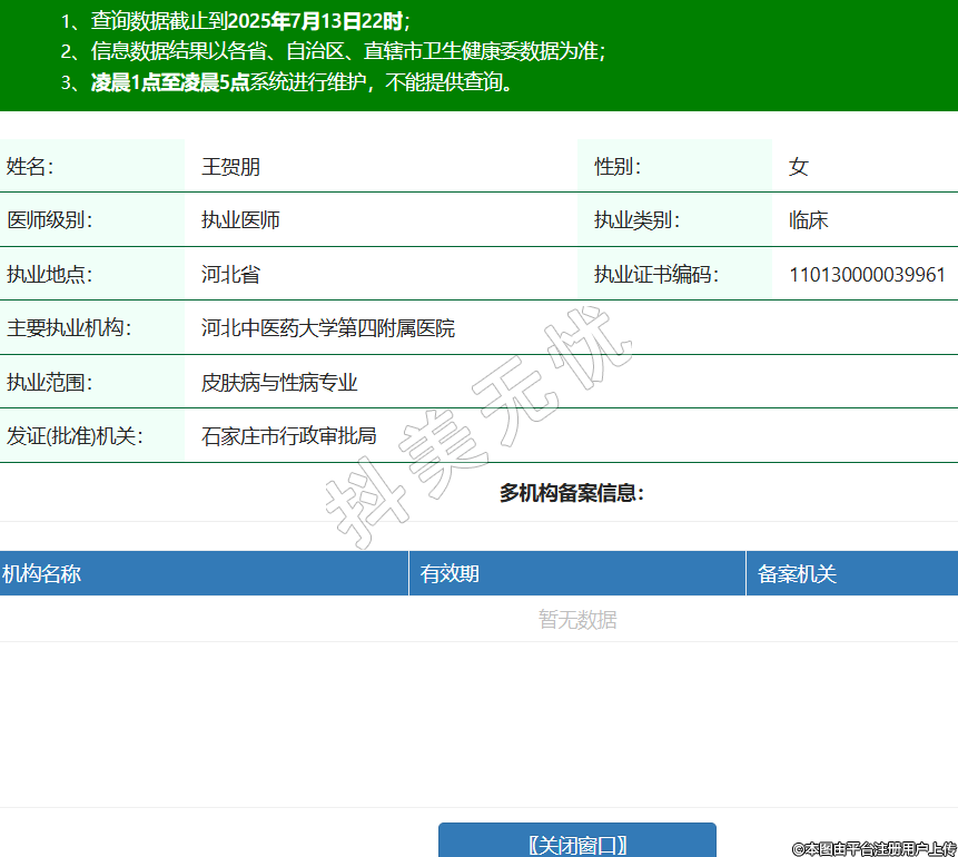 姓名:王賀朋性別:女醫(yī)師級(jí)別:執(zhí)業(yè)醫(yī)師執(zhí)業(yè)類(lèi)別:臨床執(zhí)業(yè)地點(diǎn):河北省執(zhí)業(yè)證書(shū)編碼:110130000039961主要執(zhí)業(yè)機(jī)構(gòu):河北中醫(yī)藥大學(xué)第四附屬醫(yī)院執(zhí)業(yè)范圍:皮膚病與性病專(zhuān)業(yè)發(fā)證(批準(zhǔn))機(jī)關(guān):石家莊市行政審批局 -