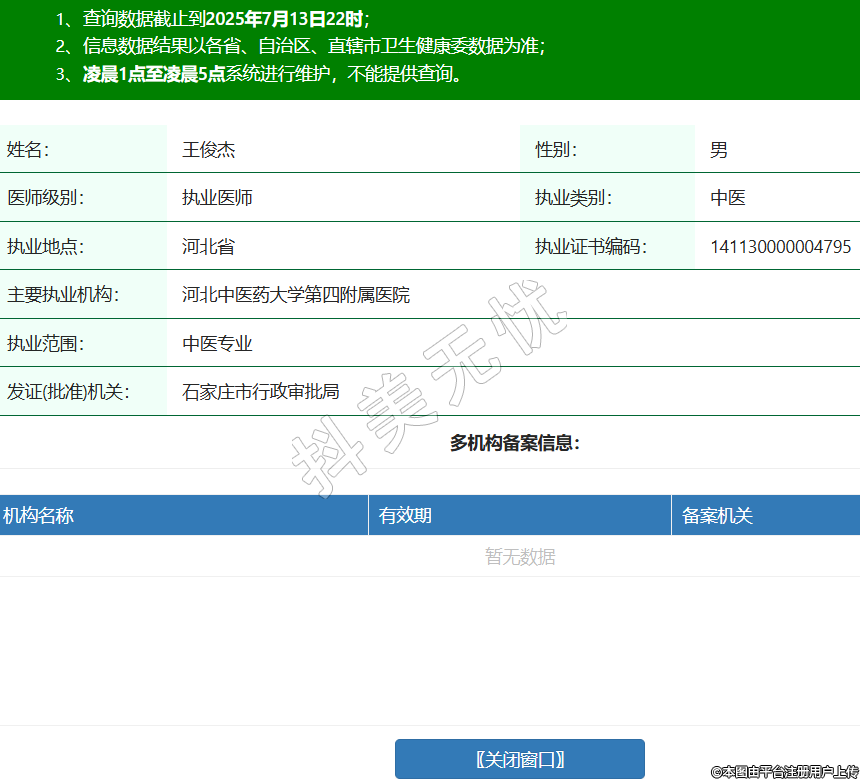 姓名:王俊杰性別:男醫(yī)師級(jí)別:執(zhí)業(yè)醫(yī)師執(zhí)業(yè)類別:中醫(yī)執(zhí)業(yè)地點(diǎn):河北省執(zhí)業(yè)證書編碼:141130000004795主要執(zhí)業(yè)機(jī)構(gòu):河北中醫(yī)藥大學(xué)第四附屬醫(yī)院執(zhí)業(yè)范圍:中醫(yī)專業(yè)發(fā)證(批準(zhǔn))機(jī)關(guān):石家莊市行政審批局 -