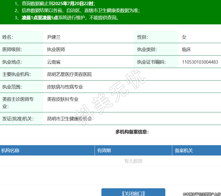 姓名:尹建蘭性別:女醫(yī)師級(jí)別:執(zhí)業(yè)醫(yī)師執(zhí)業(yè)類別:臨床執(zhí)業(yè)地點(diǎn):云南省執(zhí)業(yè)證書編碼:110530103004483主要執(zhí)業(yè)機(jī)構(gòu):昆明藝星醫(yī)療美容醫(yī)院執(zhí)業(yè)范圍:皮膚病與性病專業(yè)美容主診醫(yī)師專業(yè):美容皮膚科專業(yè)發(fā)證(批準(zhǔn))機(jī)關(guān):昆明市衛(wèi)生健康委員會(huì) -