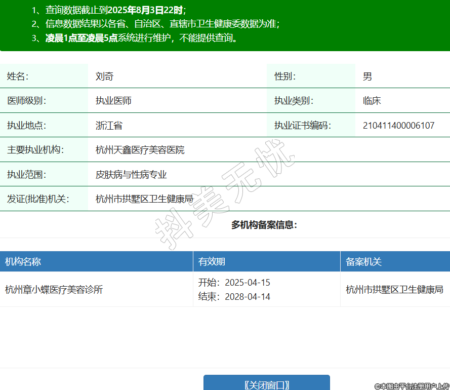 姓名:劉奇性別:男醫(yī)師級別:執(zhí)業(yè)醫(yī)師執(zhí)業(yè)類別:臨床執(zhí)業(yè)地點:浙江省執(zhí)業(yè)證書編碼:210411400006107主要執(zhí)業(yè)機構(gòu):杭州天鑫醫(yī)療美容醫(yī)院執(zhí)業(yè)范圍:皮膚病與性病專業(yè)發(fā)證(批準(zhǔn))機關(guān):杭州市拱墅區(qū)衛(wèi)生健康局多機構(gòu)備案信息:機構(gòu)名稱 有效期 備案機關(guān) 杭州章小蝶醫(yī)療美容診所 開始:2025-04-15結(jié)束:2028-04-14杭州市拱墅區(qū)衛(wèi)生健康局 -