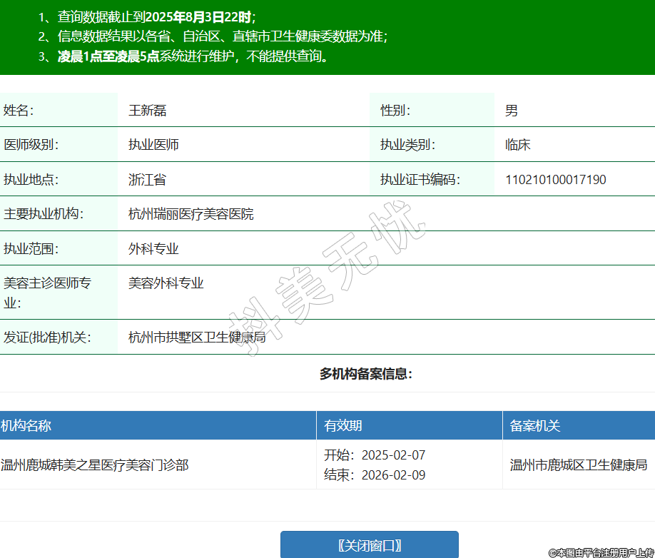 姓名:王新磊性別:男醫(yī)師級別:執(zhí)業(yè)醫(yī)師執(zhí)業(yè)類別:臨床執(zhí)業(yè)地點(diǎn):浙江省執(zhí)業(yè)證書編碼:110210100017190主要執(zhí)業(yè)機(jī)構(gòu):杭州瑞麗醫(yī)療美容醫(yī)院執(zhí)業(yè)范圍:外科專業(yè)美容主診醫(yī)師專業(yè):美容外科專業(yè)發(fā)證(批準(zhǔn))機(jī)關(guān):杭州市拱墅區(qū)衛(wèi)生健康局多機(jī)構(gòu)備案信息:機(jī)構(gòu)名稱 有效期 備案機(jī)關(guān) 溫州鹿城韓美之星醫(yī)療美容門診部 開始:2025-02-07結(jié)束:2026-02-09溫州市鹿城區(qū)衛(wèi)生健康局 -