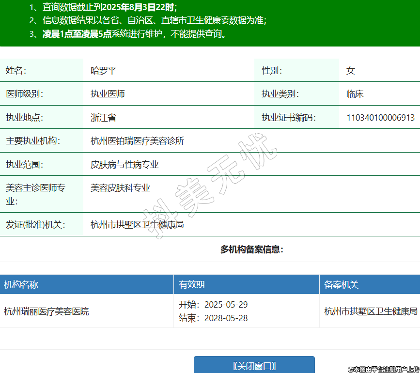 姓名:哈羅平性別:女醫(yī)師級別:執(zhí)業(yè)醫(yī)師執(zhí)業(yè)類別:臨床執(zhí)業(yè)地點:浙江省執(zhí)業(yè)證書編碼:110340100006913主要執(zhí)業(yè)機構(gòu):杭州醫(yī)鉑瑞醫(yī)療美容診所執(zhí)業(yè)范圍:皮膚病與性病專業(yè)美容主診醫(yī)師專業(yè):美容皮膚科專業(yè)發(fā)證(批準)機關(guān):杭州市拱墅區(qū)衛(wèi)生健康局多機構(gòu)備案信息:機構(gòu)名稱 有效期 備案機關(guān) 杭州瑞麗醫(yī)療美容醫(yī)院 開始:2025-05-29結(jié)束:2028-05-28杭州市拱墅區(qū)衛(wèi)生健康局 -