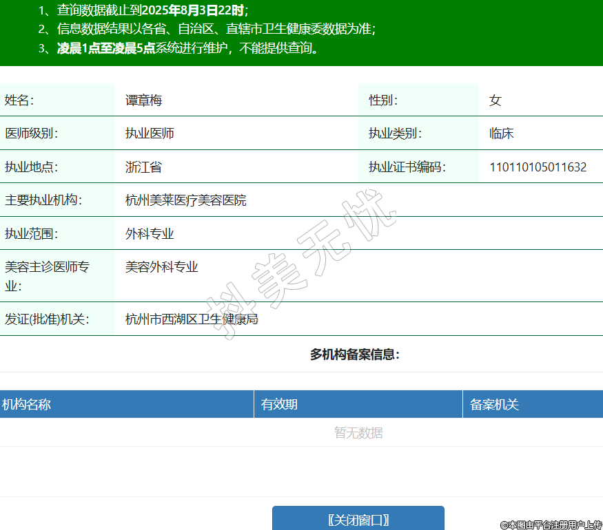 姓名:譚章梅性別:女醫(yī)師級別:執(zhí)業(yè)醫(yī)師執(zhí)業(yè)類別:臨床執(zhí)業(yè)地點:浙江省執(zhí)業(yè)證書編碼:110110105011632主要執(zhí)業(yè)機構(gòu):杭州美萊醫(yī)療美容醫(yī)院執(zhí)業(yè)范圍:外科專業(yè)美容主診醫(yī)師專業(yè):美容外科專業(yè)發(fā)證(批準)機關(guān):杭州市西湖區(qū)衛(wèi)生健康局 -