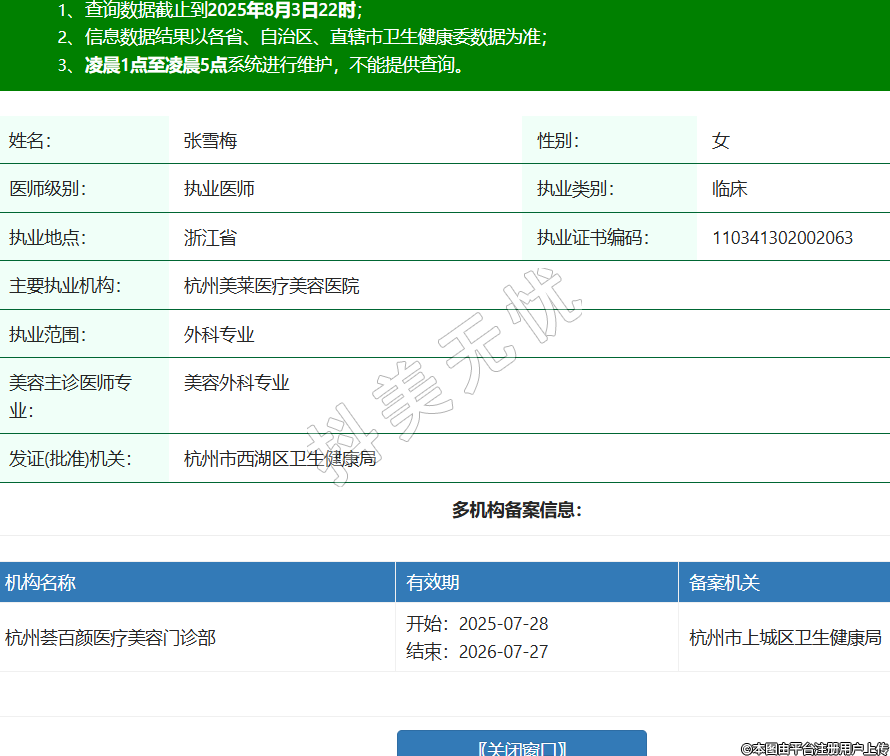 姓名:張雪梅性別:女醫(yī)師級別:執(zhí)業(yè)醫(yī)師執(zhí)業(yè)類別:臨床執(zhí)業(yè)地點(diǎn):浙江省執(zhí)業(yè)證書編碼:110341302002063主要執(zhí)業(yè)機(jī)構(gòu):杭州美萊醫(yī)療美容醫(yī)院執(zhí)業(yè)范圍:外科專業(yè)美容主診醫(yī)師專業(yè):美容外科專業(yè)發(fā)證(批準(zhǔn))機(jī)關(guān):杭州市西湖區(qū)衛(wèi)生健康局多機(jī)構(gòu)備案信息:機(jī)構(gòu)名稱 有效期 備案機(jī)關(guān) 杭州薈百顏醫(yī)療美容門診部 開始:2025-07-28結(jié)束:2026-07-27杭州市上城區(qū)衛(wèi)生健康局 -