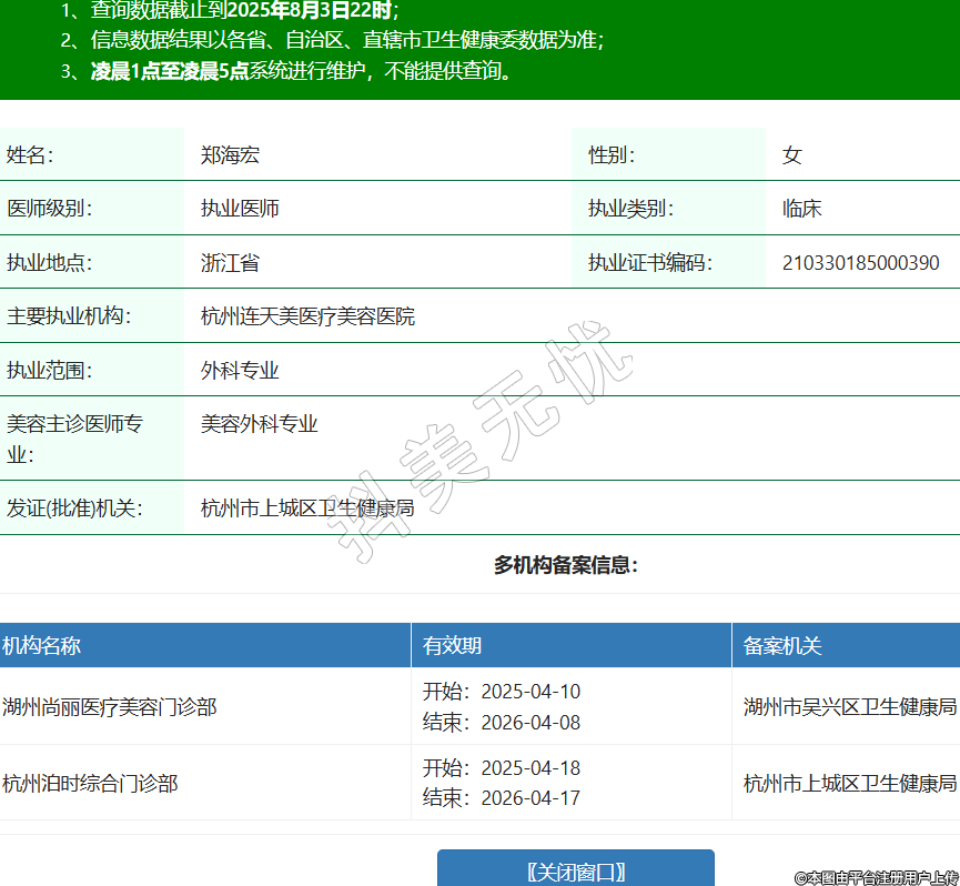 姓名:鄭海宏性別:女醫(yī)師級(jí)別:執(zhí)業(yè)醫(yī)師執(zhí)業(yè)類別:臨床執(zhí)業(yè)地點(diǎn):浙江省執(zhí)業(yè)證書編碼:210330185000390主要執(zhí)業(yè)機(jī)構(gòu):杭州連天美醫(yī)療美容醫(yī)院執(zhí)業(yè)范圍:外科專業(yè)美容主診醫(yī)師專業(yè):美容外科專業(yè)發(fā)證(批準(zhǔn))機(jī)關(guān):杭州市上城區(qū)衛(wèi)生健康局多機(jī)構(gòu)備案信息:機(jī)構(gòu)名稱 有效期 備案機(jī)關(guān) 湖州尚麗醫(yī)療美容門診部 開(kāi)始:2025-04-10結(jié)束:2026-04-08湖州市吳興區(qū)衛(wèi)生健康局 杭州泊時(shí)綜合門診部 開(kāi)始:2025-04-18結(jié)束:2026-04-17杭州市上城區(qū)衛(wèi)生健康局 -