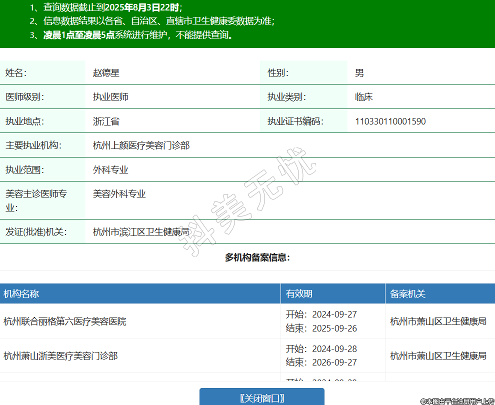 姓名:趙德星性別:男醫(yī)師級別:執(zhí)業(yè)醫(yī)師執(zhí)業(yè)類別:臨床執(zhí)業(yè)地點(diǎn):浙江省執(zhí)業(yè)證書編碼:110330110001590主要執(zhí)業(yè)機(jī)構(gòu):杭州上顏醫(yī)療美容門診部執(zhí)業(yè)范圍:外科專業(yè)美容主診醫(yī)師專業(yè):美容外科專業(yè)發(fā)證(批準(zhǔn))機(jī)關(guān):杭州市濱江區(qū)衛(wèi)生健康局多機(jī)構(gòu)備案信息:機(jī)構(gòu)名稱 有效期 備案機(jī)關(guān) 杭州聯(lián)合麗格第六醫(yī)療美容醫(yī)院 開始:2024-09-27結(jié)束:2025-09-26杭州市蕭山區(qū)衛(wèi)生健康局 杭州蕭山浙美醫(yī)療美容門診部 開始:2024-09-28結(jié)束:2026-09-27杭州市蕭山區(qū)衛(wèi)生健康局 杭州禧顏鳳起綜合門診部 開始:2024-09-29結(jié)束:2026-09-28杭州市拱墅區(qū)衛(wèi)生健康局 杭州立柏恩醫(yī)療美容有限公司蕭山利一路醫(yī)療美容診所 開始:2024-09-30結(jié)束:2025-09-29杭州市蕭山區(qū)衛(wèi)生健康局 杭州妍尚醫(yī)療美容門診部 開始:2024-10-08結(jié)束:2026-10-09杭州市上城區(qū)衛(wèi)生健康局 杭州氧葉星璨醫(yī)療美容門診部 開始:2024-10-15結(jié)束:2026-10-14杭州市拱墅區(qū)衛(wèi)生健康局 杭州蕭山童顏醫(yī)療美容門診部 開始:2024-11-03結(jié)束:2026-11-03杭州市蕭山區(qū)衛(wèi)生健康局 杭州仁術(shù)醫(yī)療管理有限公司臨平秀浦街醫(yī)療美容診所 開始:2024-12-05結(jié)束:2026-12-04杭州市臨平區(qū)衛(wèi)生健康局 杭州熙禾醫(yī)療美容門診部 開始:2024-12-12結(jié)束:2026-12-11杭州市上城區(qū)衛(wèi)生健康局 杭州蕭山新美薈醫(yī)療美容門診部 開始:2024-12-30結(jié)束:2026-12-29杭州市蕭山區(qū)衛(wèi)生健康局 杭州虎山林畔醫(yī)療美容門診部 開始:2024-12-31結(jié)束:2026-12-30杭州市拱墅區(qū)衛(wèi)生健康局 杭州潔銘威塑醫(yī)療美容醫(yī)院 開始:2025-01-24結(jié)束:2026-01-23杭州市拱墅區(qū)衛(wèi)生健康局 平陽金蔻醫(yī)療美容診所 開始:2025-03-03結(jié)束:2027-03-02平陽縣衛(wèi)生健康局 杭州蕭山貝吉雅醫(yī)療美容門診部 開始:2025-03-30結(jié)束:2026-03-29杭州市蕭山區(qū)衛(wèi)生健康局 杭州蕭山滬顏醫(yī)療美容門診部 開始:2025-04-13結(jié)束:2026-04-12杭州市蕭山區(qū)衛(wèi)生健康局 杭州喜樂醫(yī)療美容診所 開始:2025-04-16結(jié)束:2027-04-15杭州市西湖區(qū)衛(wèi)生健康局 杭州美姿醫(yī)療美容門診部 開始:2025-05-07結(jié)束:2027-05-06杭州市上城區(qū)衛(wèi)生健康局 杭州舒睿萊醫(yī)療美容診所 開始:2025-06-18結(jié)束:2028-06-17杭州市濱江區(qū)衛(wèi)生健康局 杭州熙柚醫(yī)療美容門診部 開始:2025-07-15結(jié)束:2028-07-14杭州市上城區(qū)衛(wèi)生健康局 -