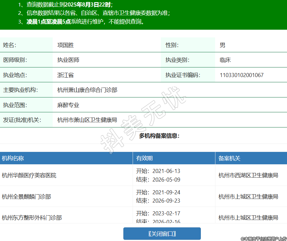 姓名:項(xiàng)國勝性別:男醫(yī)師級別:執(zhí)業(yè)醫(yī)師執(zhí)業(yè)類別:臨床執(zhí)業(yè)地點(diǎn):浙江省執(zhí)業(yè)證書編碼:110330102001067主要執(zhí)業(yè)機(jī)構(gòu):杭州蕭山康合綜合門診部執(zhí)業(yè)范圍:麻醉專業(yè)發(fā)證(批準(zhǔn))機(jī)關(guān):杭州市蕭山區(qū)衛(wèi)生健康局多機(jī)構(gòu)備案信息:機(jī)構(gòu)名稱 有效期 備案機(jī)關(guān) 杭州華顏醫(yī)療美容醫(yī)院 開始:2021-06-13結(jié)束:2026-05-09杭州市西湖區(qū)衛(wèi)生健康局 杭州全景麒麟門診部 開始:2021-09-24結(jié)束:2026-09-23杭州市上城區(qū)衛(wèi)生健康局 杭州東方整形外科門診部 開始:2023-02-17結(jié)束:2026-02-16杭州市上城區(qū)衛(wèi)生健康局 杭州蕭山碩人醫(yī)療美容門診部 開始:2023-03-15結(jié)束:2026-03-14杭州市蕭山區(qū)衛(wèi)生健康局 杭州清沐醫(yī)療美容門診部 開始:2023-06-08結(jié)束:2026-06-07杭州市濱江區(qū)衛(wèi)生健康局 杭州美佳美醫(yī)療門診部 開始:2023-07-05結(jié)束:2026-07-04杭州市拱墅區(qū)衛(wèi)生健康局 杭州格萊美醫(yī)療美容醫(yī)院 開始:2023-07-15結(jié)束:2026-07-14杭州市拱墅區(qū)衛(wèi)生健康局 杭州赫蘭氏醫(yī)療美容醫(yī)院 開始:2023-08-29結(jié)束:2026-08-28杭州市拱墅區(qū)衛(wèi)生健康局 杭州星秘醫(yī)療美容門診部 開始:2024-01-24結(jié)束:2027-01-23杭州市拱墅區(qū)衛(wèi)生健康局 杭州蕭山儷悅醫(yī)療美容門診部 開始:2024-02-28結(jié)束:2027-02-27杭州市蕭山區(qū)衛(wèi)生健康局 杭州蕭山奧蘭醫(yī)療美容門診部 開始:2024-03-12結(jié)束:2027-03-11杭州市蕭山區(qū)衛(wèi)生健康局 杭州虎山林畔醫(yī)療美容門診部 開始:2024-06-15結(jié)束:2027-06-14杭州市拱墅區(qū)衛(wèi)生健康局 杭州顏鑒醫(yī)療美容門診部 開始:2024-07-02結(jié)束:2027-07-01杭州市拱墅區(qū)衛(wèi)生健康局 杭州蕭山盛薈銘源綜合門診部 開始:2024-07-28結(jié)束:2027-07-27杭州市蕭山區(qū)衛(wèi)生健康局 杭州瑞秀綜合門診部 開始:2024-08-20結(jié)束:2027-08-19杭州市拱墅區(qū)衛(wèi)生健康局 杭州熙禾醫(yī)療美容門診部 開始:2024-08-26結(jié)束:2027-08-25杭州市上城區(qū)衛(wèi)生健康局 杭州潔銘威塑醫(yī)療美容醫(yī)院 開始:2025-01-10結(jié)束:2026-01-09杭州市拱墅區(qū)衛(wèi)生健康局 杭州清鍇醫(yī)療美容門診部 開始:2025-02-18結(jié)束:2027-02-17杭州市上城區(qū)衛(wèi)生健康局 杭州西興星圣婭醫(yī)療美容門診部 開始:2025-03-22結(jié)束:2026-03-21杭州市濱江區(qū)衛(wèi)生健康局 杭州瑞智醫(yī)療美容門診部 開始:2025-05-22結(jié)束:2027-04-30杭州市上城區(qū)衛(wèi)生健康局 杭州熙柚醫(yī)療美容門診部 開始:2025-06-04結(jié)束:2028-06-03杭州市上城區(qū)衛(wèi)生健康局 杭州靜港醫(yī)療美容診所 開始:2025-06-10結(jié)束:2028-06-09杭州市拱墅區(qū)衛(wèi)生健康局 杭州潮牌美肌綜合門診部 開始:2025-06-19結(jié)束:2026-06-18杭州市拱墅區(qū)衛(wèi)生健康局 -