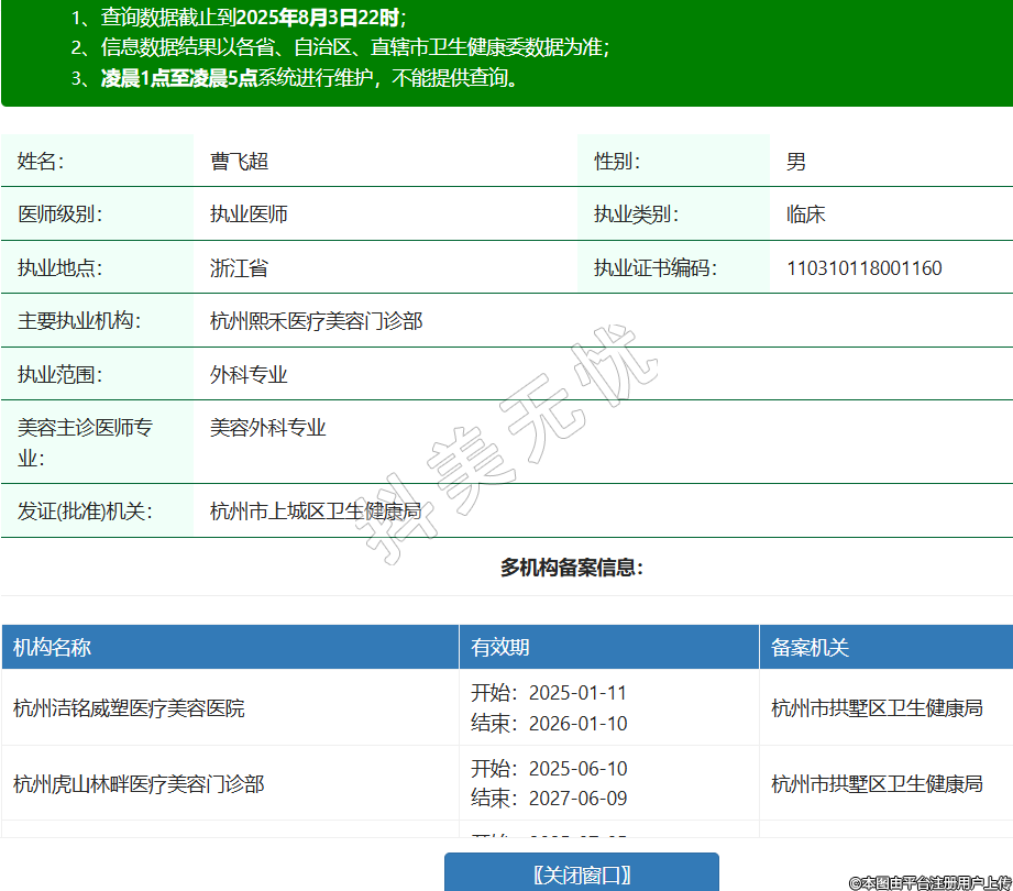姓名:曹飛超性別:男醫(yī)師級別:執(zhí)業(yè)醫(yī)師執(zhí)業(yè)類別:臨床執(zhí)業(yè)地點:浙江省執(zhí)業(yè)證書編碼:110310118001160主要執(zhí)業(yè)機構(gòu):杭州熙禾醫(yī)療美容門診部執(zhí)業(yè)范圍:外科專業(yè)美容主診醫(yī)師專業(yè):美容外科專業(yè)發(fā)證(批準)機關:杭州市上城區(qū)衛(wèi)生健康局多機構(gòu)備案信息:機構(gòu)名稱 有效期 備案機關 杭州潔銘威塑醫(yī)療美容醫(yī)院 開始:2025-01-11結(jié)束:2026-01-10杭州市拱墅區(qū)衛(wèi)生健康局 杭州虎山林畔醫(yī)療美容門診部 開始:2025-06-10結(jié)束:2027-06-09杭州市拱墅區(qū)衛(wèi)生健康局 杭州熙柚醫(yī)療美容門診部 開始:2025-07-05結(jié)束:2028-07-04杭州市上城區(qū)衛(wèi)生健康局 -