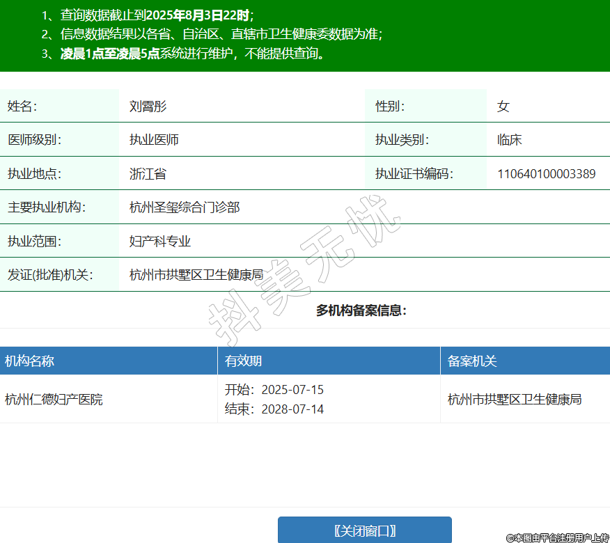 姓名:劉霄彤性別:女醫(yī)師級別:執(zhí)業(yè)醫(yī)師執(zhí)業(yè)類別:臨床執(zhí)業(yè)地點:浙江省執(zhí)業(yè)證書編碼:110640100003389主要執(zhí)業(yè)機構(gòu):杭州圣璽綜合門診部執(zhí)業(yè)范圍:婦產(chǎn)科專業(yè)發(fā)證(批準)機關:杭州市拱墅區(qū)衛(wèi)生健康局多機構(gòu)備案信息:機構(gòu)名稱 有效期 備案機關 杭州仁德婦產(chǎn)醫(yī)院 開始:2025-07-15結(jié)束:2028-07-14杭州市拱墅區(qū)衛(wèi)生健康局 -