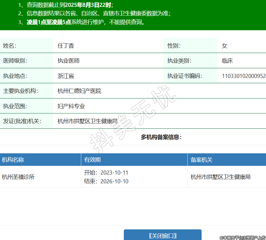 姓名:任丁香性別:女醫(yī)師級別:執(zhí)業(yè)醫(yī)師執(zhí)業(yè)類別:臨床執(zhí)業(yè)地點(diǎn):浙江省執(zhí)業(yè)證書編碼:110330102000952主要執(zhí)業(yè)機(jī)構(gòu):杭州仁德婦產(chǎn)醫(yī)院執(zhí)業(yè)范圍:婦產(chǎn)科專業(yè)發(fā)證(批準(zhǔn))機(jī)關(guān):杭州市拱墅區(qū)衛(wèi)生健康局多機(jī)構(gòu)備案信息:機(jī)構(gòu)名稱 有效期 備案機(jī)關(guān) 杭州圣禧診所 開始:2023-10-11結(jié)束:2026-10-10杭州市拱墅區(qū)衛(wèi)生健康局 -