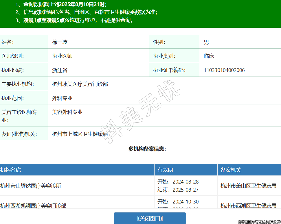 姓名:徐一波性別:男醫(yī)師級別:執(zhí)業(yè)醫(yī)師執(zhí)業(yè)類別:臨床執(zhí)業(yè)地點(diǎn):浙江省執(zhí)業(yè)證書編碼:110330104002006主要執(zhí)業(yè)機(jī)構(gòu):杭州冰美醫(yī)療美容門診部執(zhí)業(yè)范圍:外科專業(yè)美容主診醫(yī)師專業(yè):美容外科專業(yè)發(fā)證(批準(zhǔn))機(jī)關(guān):杭州市上城區(qū)衛(wèi)生健康局多機(jī)構(gòu)備案信息:機(jī)構(gòu)名稱 有效期 備案機(jī)關(guān) 杭州蕭山耀然醫(yī)療美容診所 開始:2024-08-28結(jié)束:2025-08-27杭州市蕭山區(qū)衛(wèi)生健康局 杭州西湖凱驪醫(yī)療美容門診部 開始:2024-10-30結(jié)束:2026-10-29杭州市西湖區(qū)衛(wèi)生健康局 杭州麗脂醫(yī)療科技有限公司和興路醫(yī)療美容門診部 開始:2024-12-17結(jié)束:2025-12-16杭州市上城區(qū)衛(wèi)生健康局 杭州蕭山蘭澤歐醫(yī)療美容門診部 開始:2025-04-16結(jié)束:2026-04-15杭州市蕭山區(qū)衛(wèi)生健康局 杭州至優(yōu)美醫(yī)療美容診所 開始:2025-06-18結(jié)束:2026-06-17杭州市上城區(qū)衛(wèi)生健康局 紹興柯橋璣理醫(yī)療美容門診部 開始:2025-06-23結(jié)束:2026-06-22紹興市柯橋區(qū)衛(wèi)生健康局 杭州凱齡醫(yī)療美容門診部 開始:2025-08-04結(jié)束:2029-08-03杭州市西湖區(qū)衛(wèi)生健康局 -