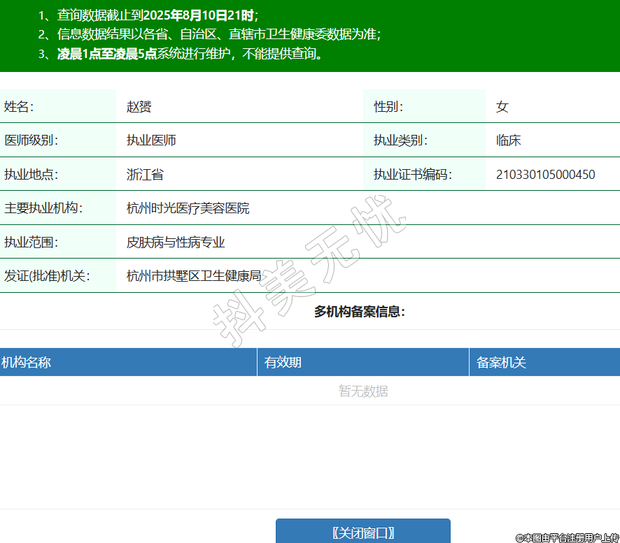 姓名:趙赟性別:女醫(yī)師級(jí)別:執(zhí)業(yè)醫(yī)師執(zhí)業(yè)類別:臨床執(zhí)業(yè)地點(diǎn):浙江省執(zhí)業(yè)證書(shū)編碼:210330105000450主要執(zhí)業(yè)機(jī)構(gòu):杭州時(shí)光醫(yī)療美容醫(yī)院執(zhí)業(yè)范圍:皮膚病與性病專業(yè)發(fā)證(批準(zhǔn))機(jī)關(guān):杭州市拱墅區(qū)衛(wèi)生健康局 -