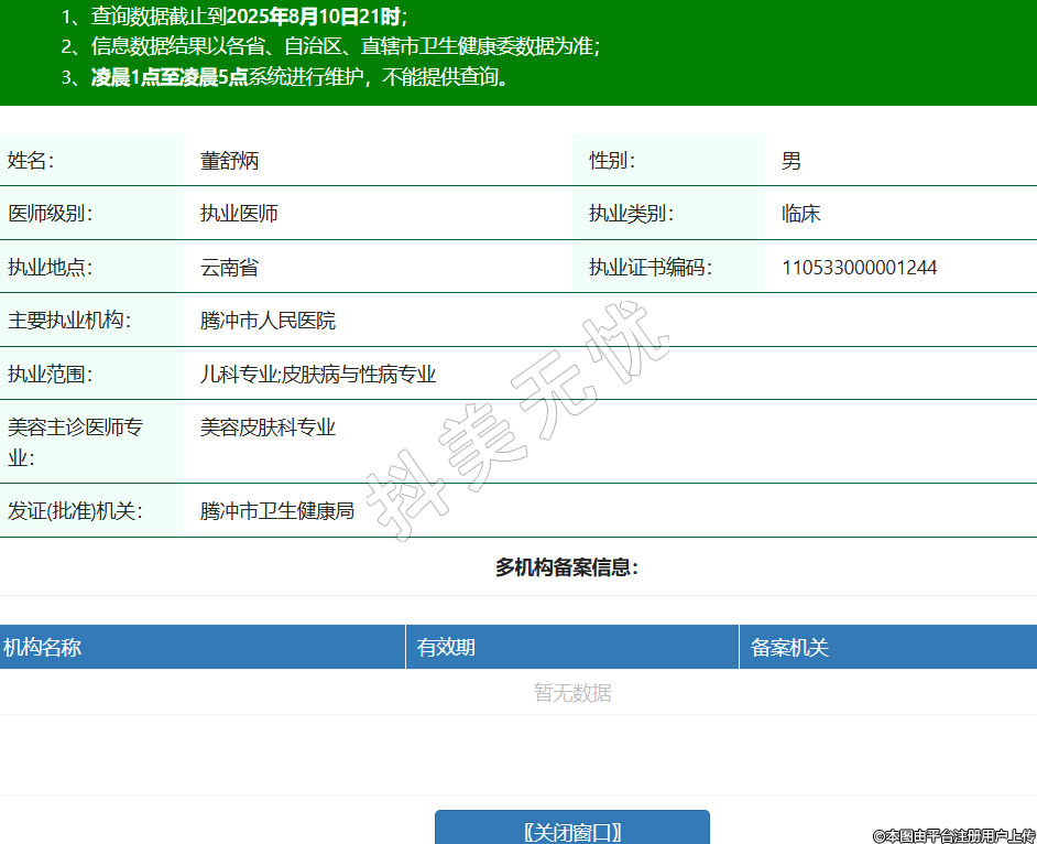 姓名:董舒炳性別:男醫(yī)師級別:執(zhí)業(yè)醫(yī)師執(zhí)業(yè)類別:臨床執(zhí)業(yè)地點:云南省執(zhí)業(yè)證書編碼:110533000001244主要執(zhí)業(yè)機構:騰沖市人民醫(yī)院執(zhí)業(yè)范圍:兒科專業(yè);皮膚病與性病專業(yè)美容主診醫(yī)師專業(yè):美容皮膚科專業(yè)發(fā)證(批準)機關:騰沖市衛(wèi)生健康局 -