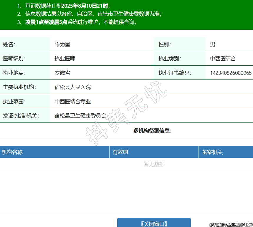 姓名:陳為星性別:男醫(yī)師級別:執(zhí)業(yè)醫(yī)師執(zhí)業(yè)類別:中西醫(yī)結合執(zhí)業(yè)地點:安徽省執(zhí)業(yè)證書編碼:142340826000065主要執(zhí)業(yè)機構:宿松縣人民醫(yī)院執(zhí)業(yè)范圍:中西醫(yī)結合專業(yè)發(fā)證(批準)機關:宿松縣衛(wèi)生健康委員會 -