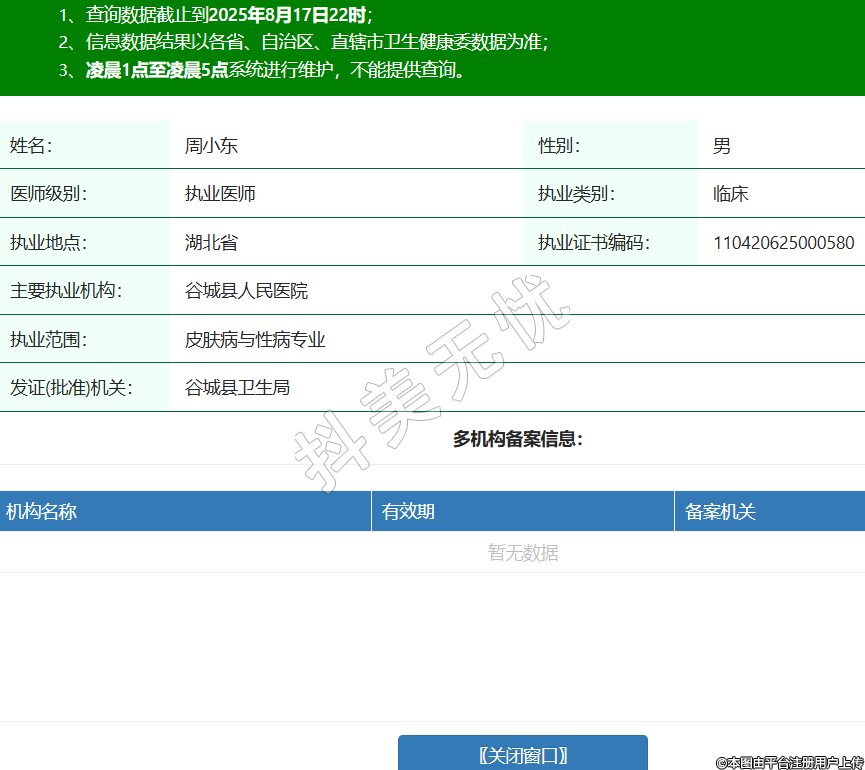 姓名:周小東性別:男醫(yī)師級(jí)別:執(zhí)業(yè)醫(yī)師執(zhí)業(yè)類(lèi)別:臨床執(zhí)業(yè)地點(diǎn):湖北省執(zhí)業(yè)證書(shū)編碼:110420625000580主要執(zhí)業(yè)機(jī)構(gòu):谷城縣人民醫(yī)院執(zhí)業(yè)范圍:皮膚病與性病專業(yè)發(fā)證(批準(zhǔn))機(jī)關(guān):谷城縣衛(wèi)生局 -