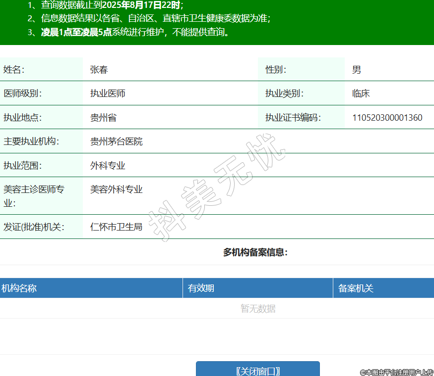 姓名:張春性別:男醫(yī)師級別:執(zhí)業(yè)醫(yī)師執(zhí)業(yè)類別:臨床執(zhí)業(yè)地點(diǎn):貴州省執(zhí)業(yè)證書編碼:110520300001360主要執(zhí)業(yè)機(jī)構(gòu):貴州茅臺醫(yī)院執(zhí)業(yè)范圍:外科專業(yè)美容主診醫(yī)師專業(yè):美容外科專業(yè)發(fā)證(批準(zhǔn))機(jī)關(guān):仁懷市衛(wèi)生局 -