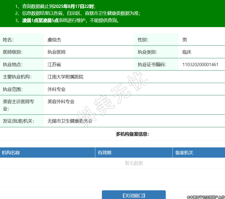姓名:虞俊杰性別:男醫(yī)師級別:執(zhí)業(yè)醫(yī)師執(zhí)業(yè)類別:臨床執(zhí)業(yè)地點:江蘇省執(zhí)業(yè)證書編碼:110320200001461主要執(zhí)業(yè)機構(gòu):江南大學(xué)附屬醫(yī)院執(zhí)業(yè)范圍:外科專業(yè)美容主診醫(yī)師專業(yè):美容外科專業(yè)發(fā)證(批準(zhǔn))機關(guān):無錫市衛(wèi)生健康委員會 -
