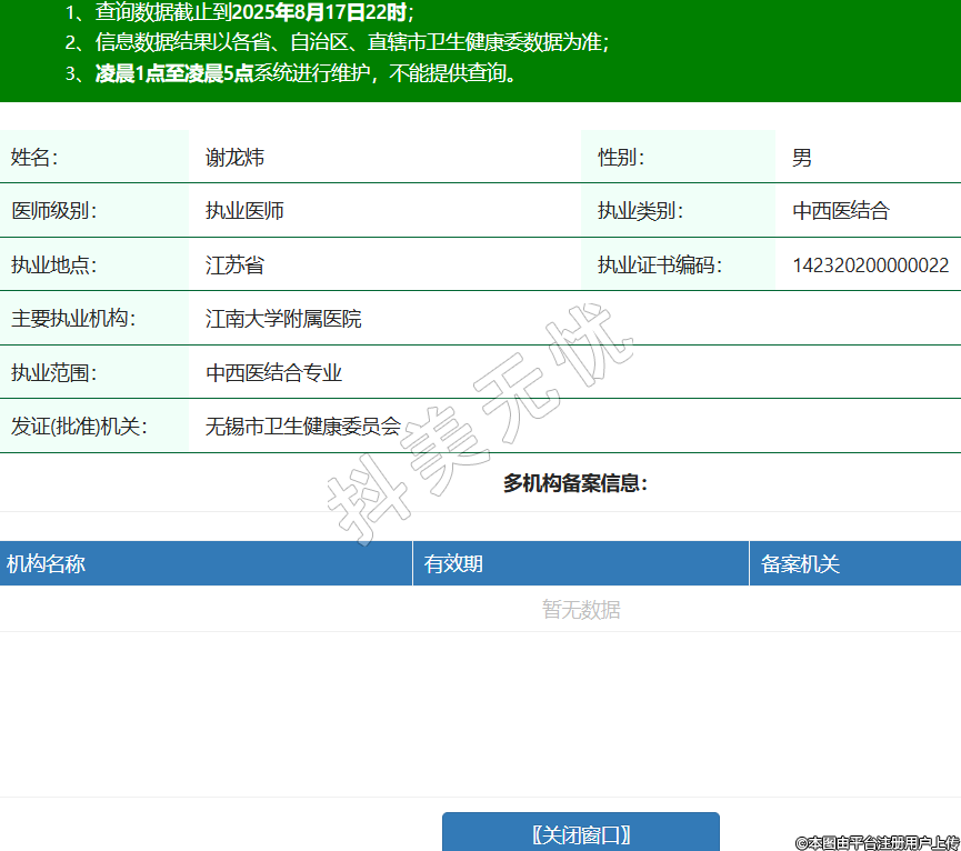 姓名:謝龍煒性別:男醫(yī)師級別:執(zhí)業(yè)醫(yī)師執(zhí)業(yè)類別:中西醫(yī)結(jié)合執(zhí)業(yè)地點(diǎn):江蘇省執(zhí)業(yè)證書編碼:142320200000022主要執(zhí)業(yè)機(jī)構(gòu):江南大學(xué)附屬醫(yī)院執(zhí)業(yè)范圍:中西醫(yī)結(jié)合專業(yè)發(fā)證(批準(zhǔn))機(jī)關(guān):無錫市衛(wèi)生健康委員會 -