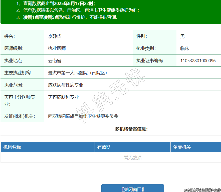 姓名:李靜華性別:男醫(yī)師級(jí)別:執(zhí)業(yè)醫(yī)師執(zhí)業(yè)類(lèi)別:臨床執(zhí)業(yè)地點(diǎn):云南省執(zhí)業(yè)證書(shū)編碼:110532801000096主要執(zhí)業(yè)機(jī)構(gòu):景洪市第一人民醫(yī)院(南院區(qū))執(zhí)業(yè)范圍:皮膚病與性病專(zhuān)業(yè)美容主診醫(yī)師專(zhuān)業(yè):美容皮膚科專(zhuān)業(yè)發(fā)證(批準(zhǔn))機(jī)關(guān):西雙版納傣族自治州衛(wèi)生健康委員會(huì) -