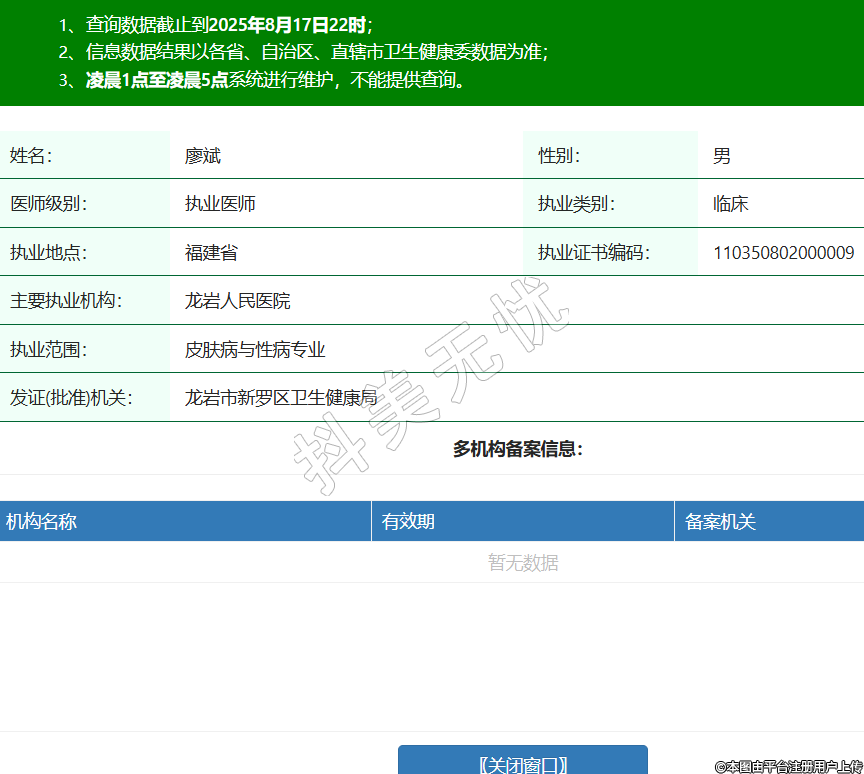 姓名:廖斌性別:男醫(yī)師級別:執(zhí)業(yè)醫(yī)師執(zhí)業(yè)類別:臨床執(zhí)業(yè)地點:福建省執(zhí)業(yè)證書編碼:110350802000009主要執(zhí)業(yè)機構(gòu):龍巖人民醫(yī)院執(zhí)業(yè)范圍:皮膚病與性病專業(yè)發(fā)證(批準)機關(guān):龍巖市新羅區(qū)衛(wèi)生健康局 -